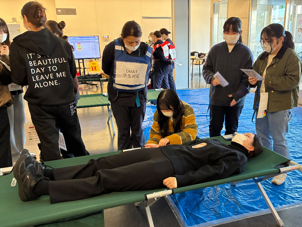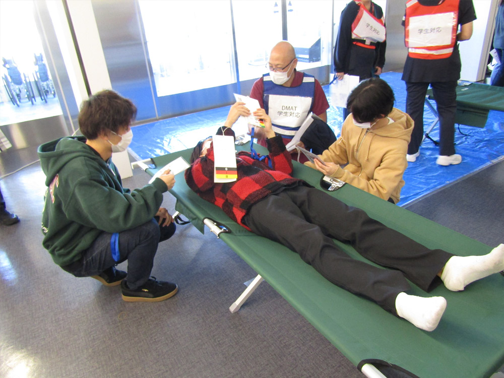 本学からは、医療保健学部、看護学部の学生が模擬患者役となり、搬送、トリアージなどを受けました。