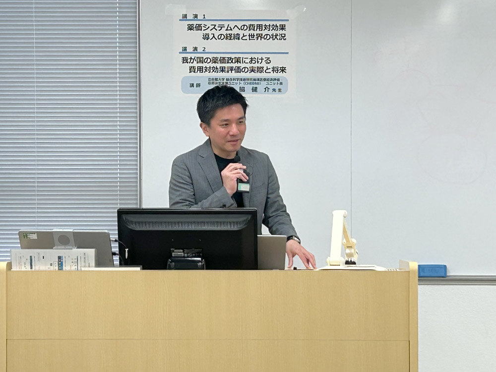 セミナーは、森脇健介先生(立命館大学 総合科学技術研究機構医療経済評価・意思決定支援ユニット(CHEERS)・ユニット長)に「薬価システムへの費用対効果評価導入の経緯と世界の状況」「我が国の薬価政策における費用対効果評価の実際と将来」という2つテーマでお話しいただきました。