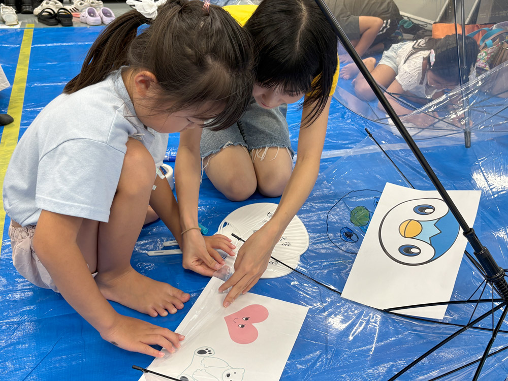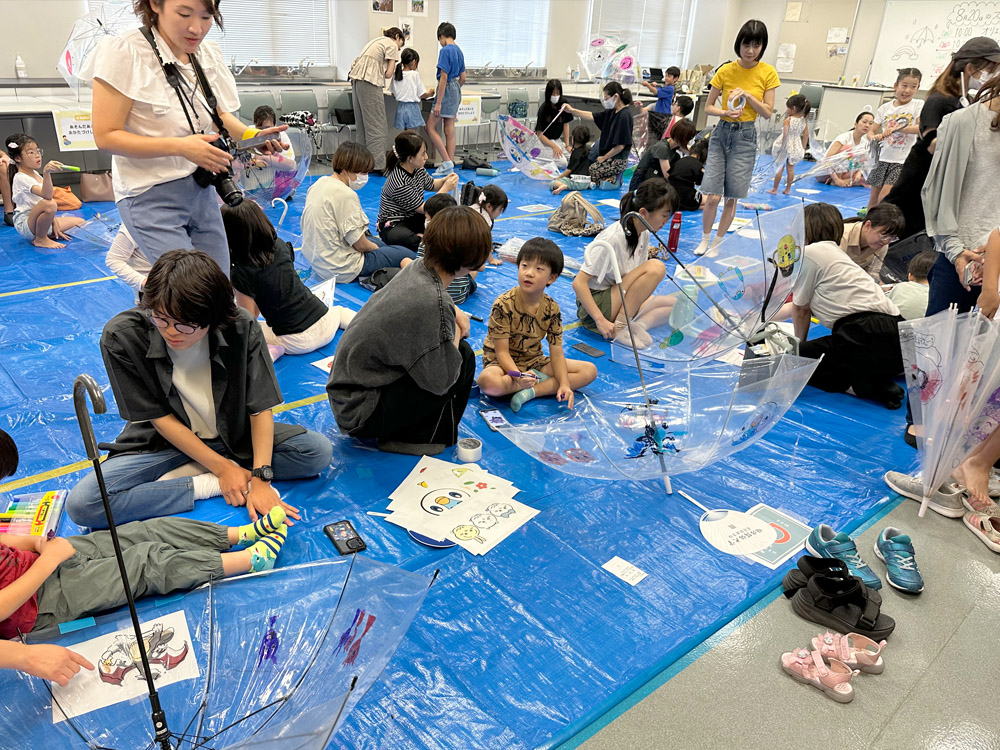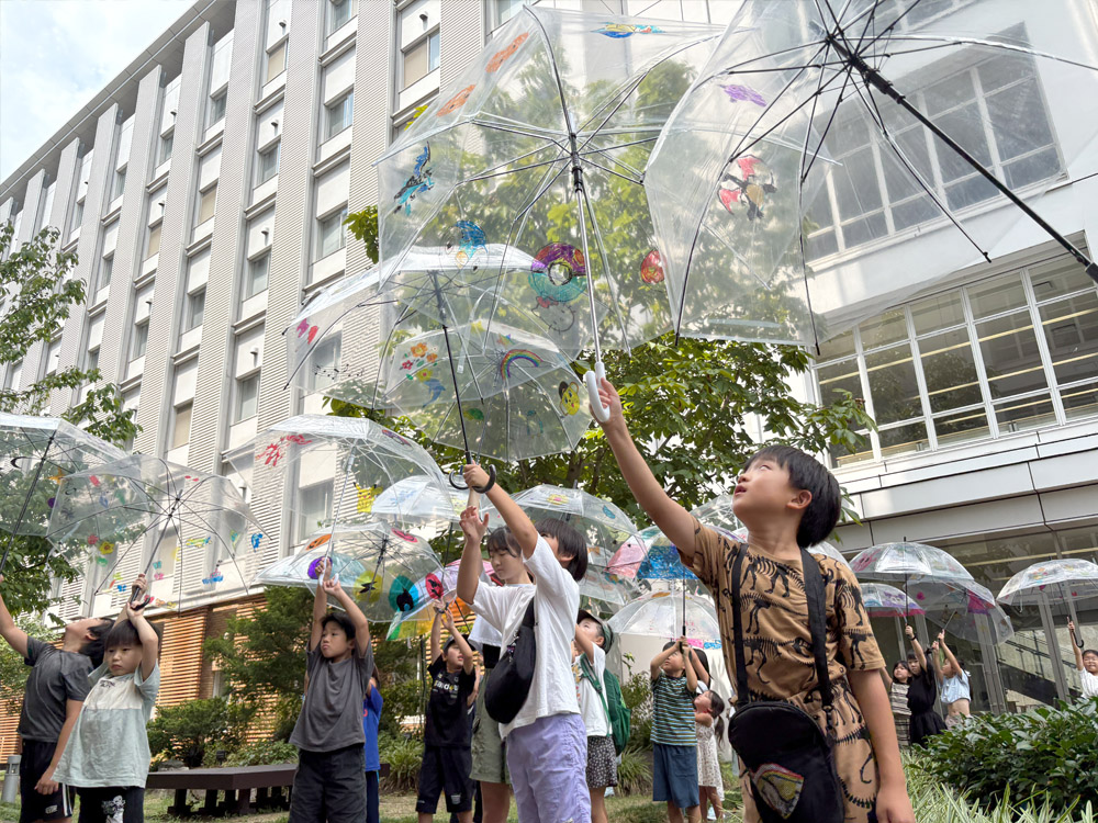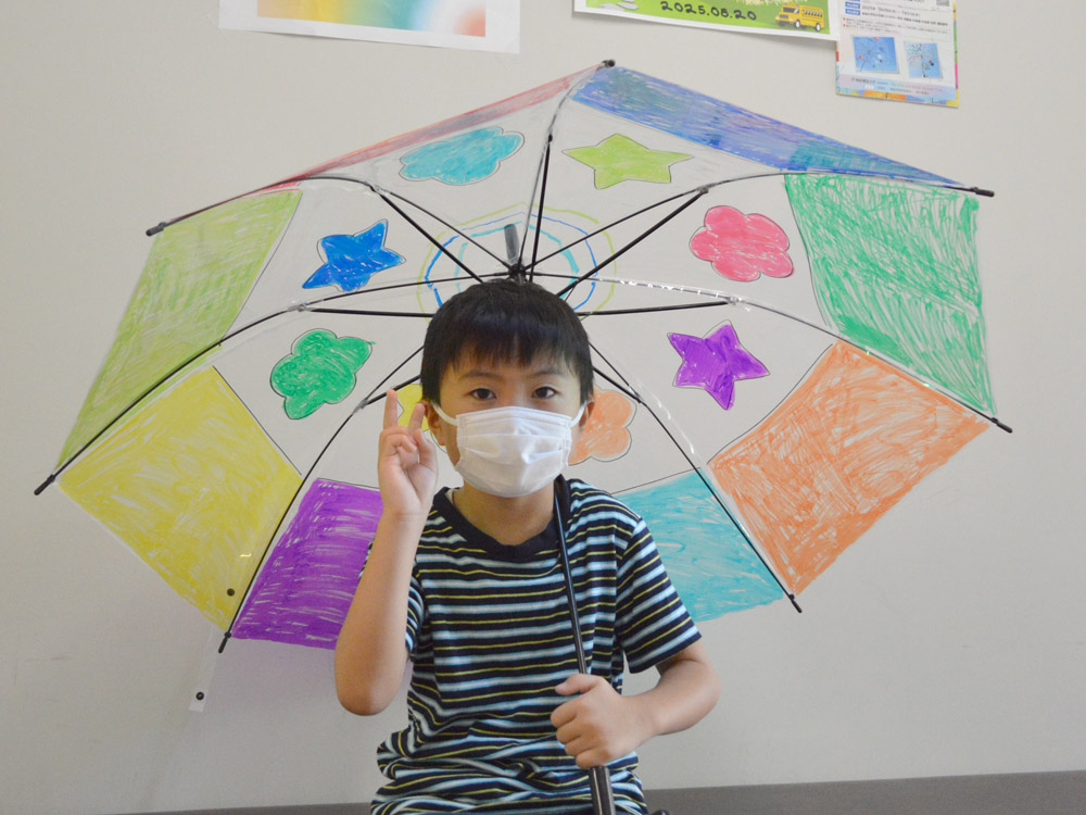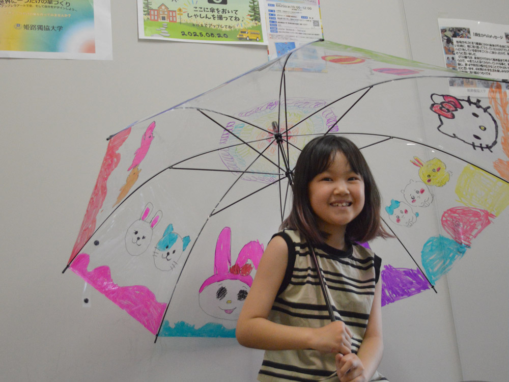 2025年8月20日(水)、姫路獨協大学 医療保健学部作業療法学科では、地域の小学生を対象に夏休みふれあい工作教室『世界に一つだけの傘づくり~アンブレラアートで空、そして自分をデザインしよう~』を開催しました。沖嶋今日太教授、友國由美子講師と作業療法学科の学生と一緒に、アンブレラアートを楽しみました。参加した子どもたちは、透明の傘にマジックペンで自由に絵や模様を描き、自分だけのオリジナル傘を完成させました。