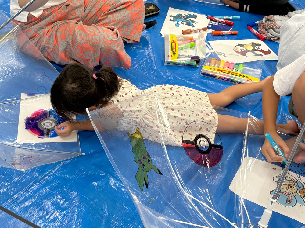 集合写真では、思いっきりお空に傘を突き出したポーズ、傘を抱えてピースしたポーズと2パターンの撮影を行いました。当日は晴天でしたが、太陽の光を透かした色とりどりのデザインがとても美しく輝いていました。子どもたちも「自分だけの傘ができてうれしい!」と笑顔いっぱいでした。