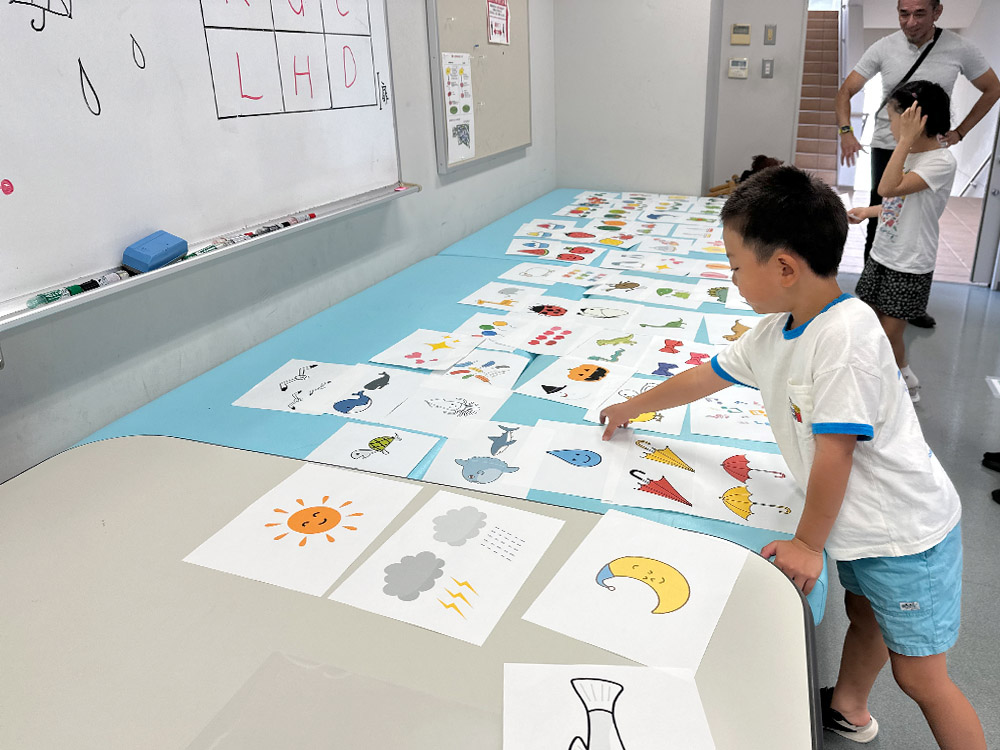途中、作業療法学科の学生とお話しながら、一緒に協力して絵を描いたり、保護者の方と考えながらイラストの配置を考えたりと、コミュニケーションを取りながら進めていく姿がとても楽しそうで、見ているこちらも思わず微笑んでしまう、温かい時間でした。