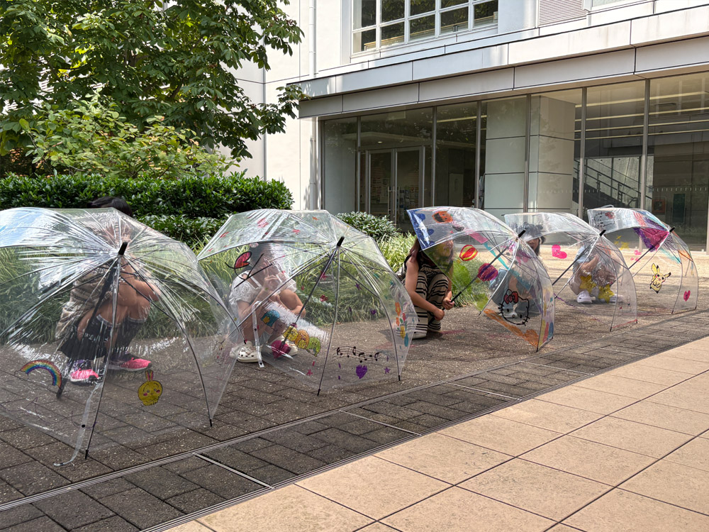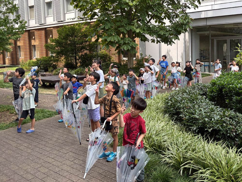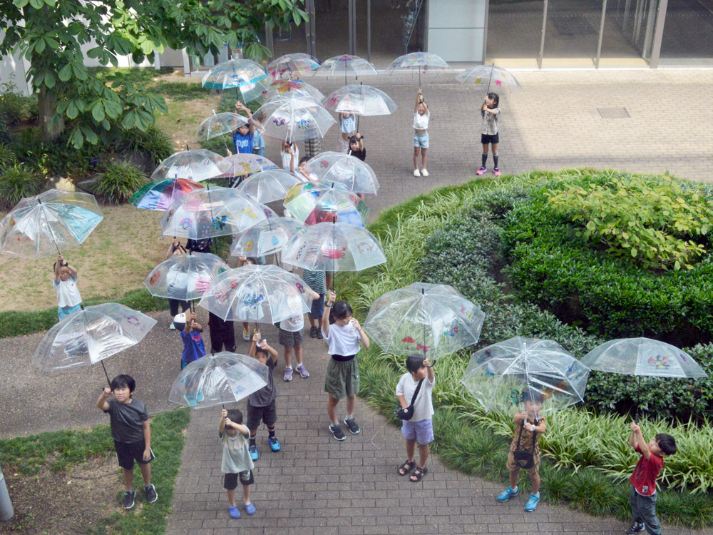 工作教室の会場を出たら、今度は中庭へ「世界に一つだけの傘」をもって移動しました。